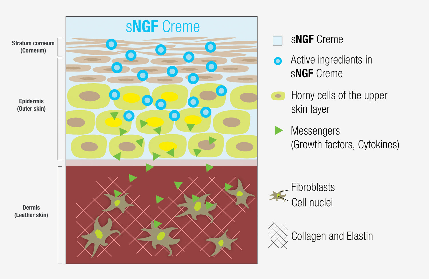 In the mode of action, communication between the outer and inner layers of the skin is utilized, that is, the communication of cells of the epidermis (outer layer) with the cells of the dermis (inner layer). Growth factors are important for the formation of new collagen and elastin. Keratinocytes (horn cells of the upper skin layer) are stimulated to produce and release messenger molecules such as growth factors and cytokines. The messenger molecules then penetrate from the epidermis (outer layer) into the dermis (inner layer). They reach the fibroblasts, where they bind to specific receptors on the cell surface and then transmit the signal for the formation of new collagen and elastin to the cell nuclei.